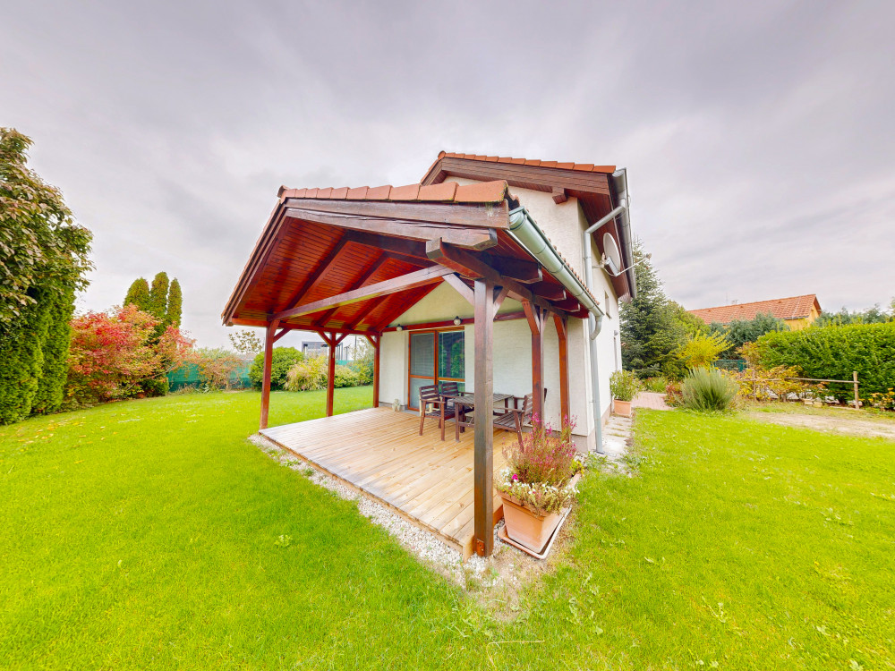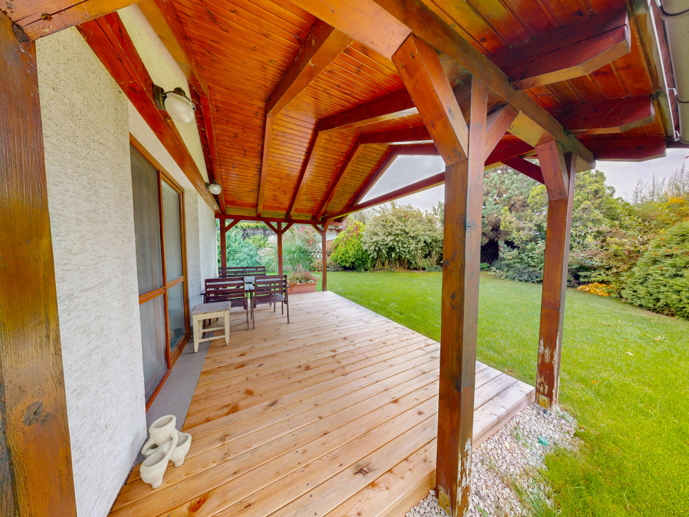 Na dom nadväzuje krytá drevená terasa so záhradným nábytkom.